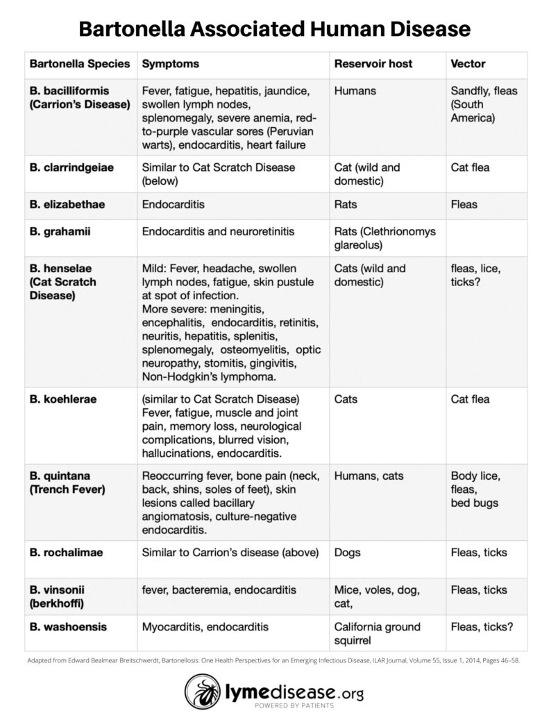Bartonella is best known for causing cat scratch disease but it can also be acquired thru tick bites, leading to bartonellosis.